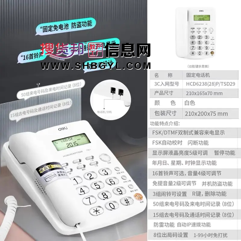 本网页所展示的有关【得力电话机水晶按键有线坐式固定电话机】的信息/图片/参数等由的会员【上海诚隆文具有限公司】提供,由搜货邦会员【上海诚隆文具有限公司 】自行对信息/图片/参数等的真实性、准确性和合法性负责,本平台(本网站)仅提供展示服务,请谨慎交易,因交易而产生的法律关系及法律纠纷由您自行协商解决,本平台(本网站)对此不承担任何责任。您在本网页可以浏览【得力电话机水晶按键有线坐式固定电话机】有关的信息/图片/价格等及提供【得力电话机水晶按键有线坐式固定电话机】的商家公司简介、联系方式等信息。
